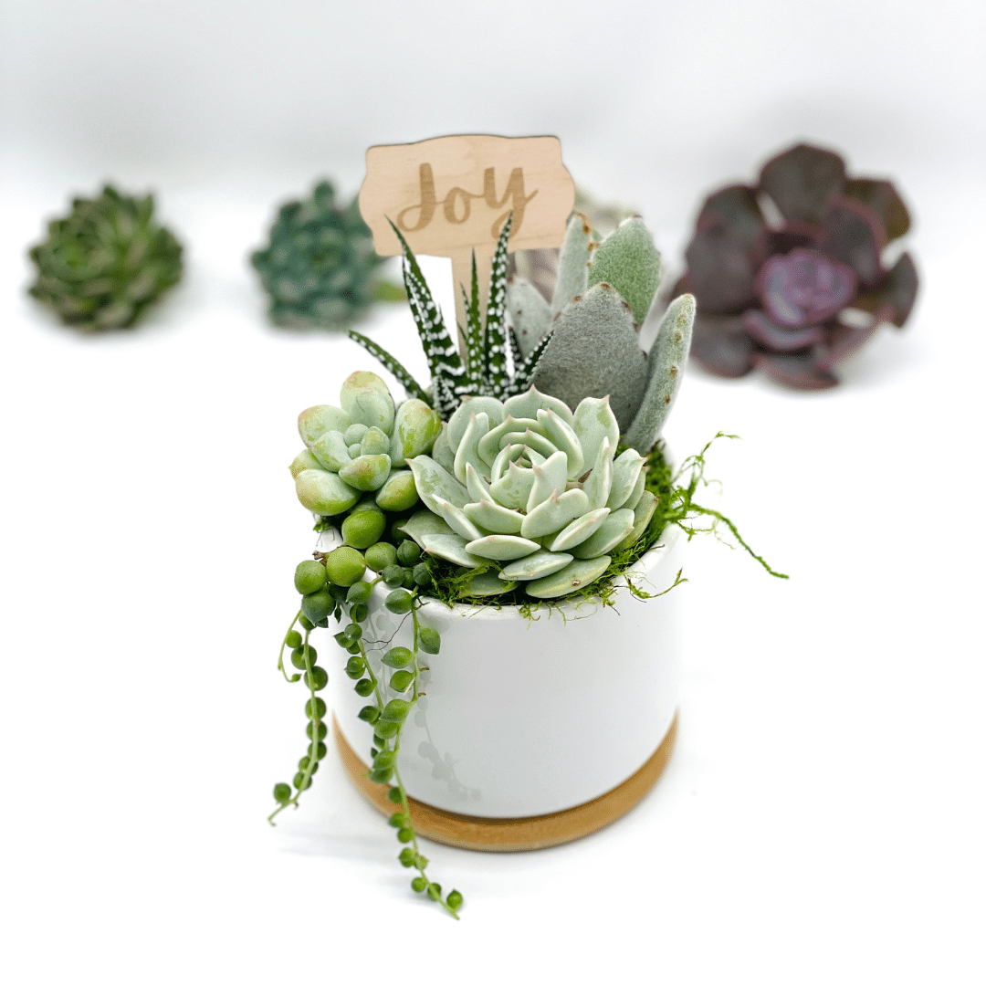 Give a gift that succs! This beautiful succulent arrangement is the perfect gift for birthdays, anniversaries...really any special event! Each arrangement comes with a chalkboard stake that can be personalized with a word or short phrase of your choice.